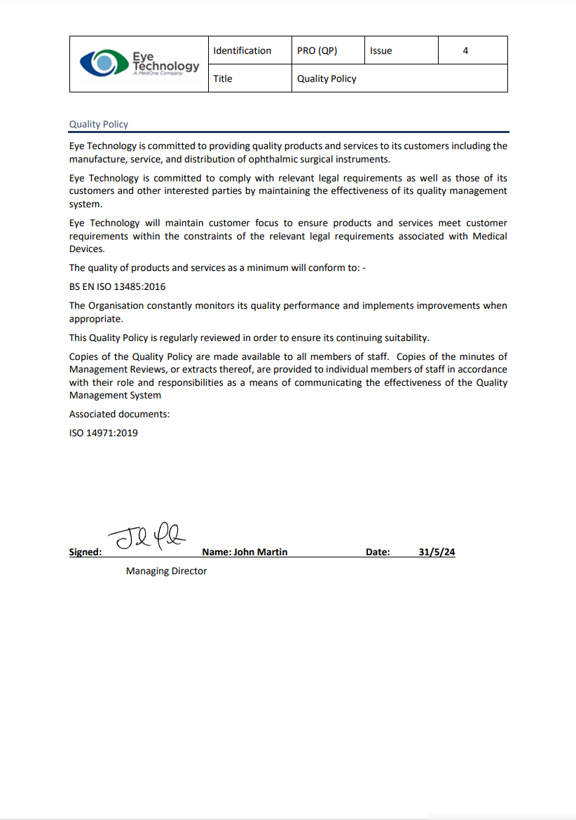 Eye Technology firmly believes that the most important feature of a medical device is quality. The product must work as intended every time. At Eye Technology we utilise a rigorous quality system of design, inspection, and testing to ensure our products are of the highest possible quality.